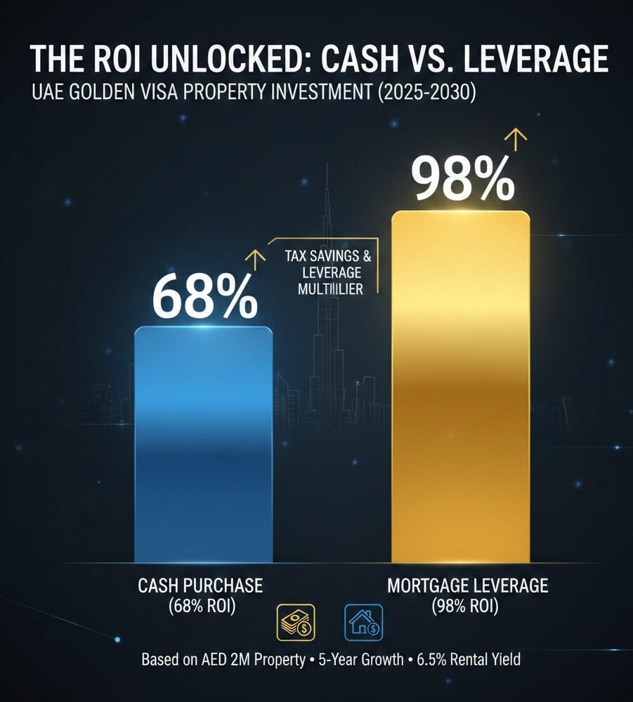 Whether you choose the leverage of a mortgage (98% ROI) or the safety of a cash purchase (68% ROI), the combination of capital appreciation, rental yields, and tax efficiency makes Dubai the top destination for maximizing Golden Visa Investment ROI in 2025-2030.