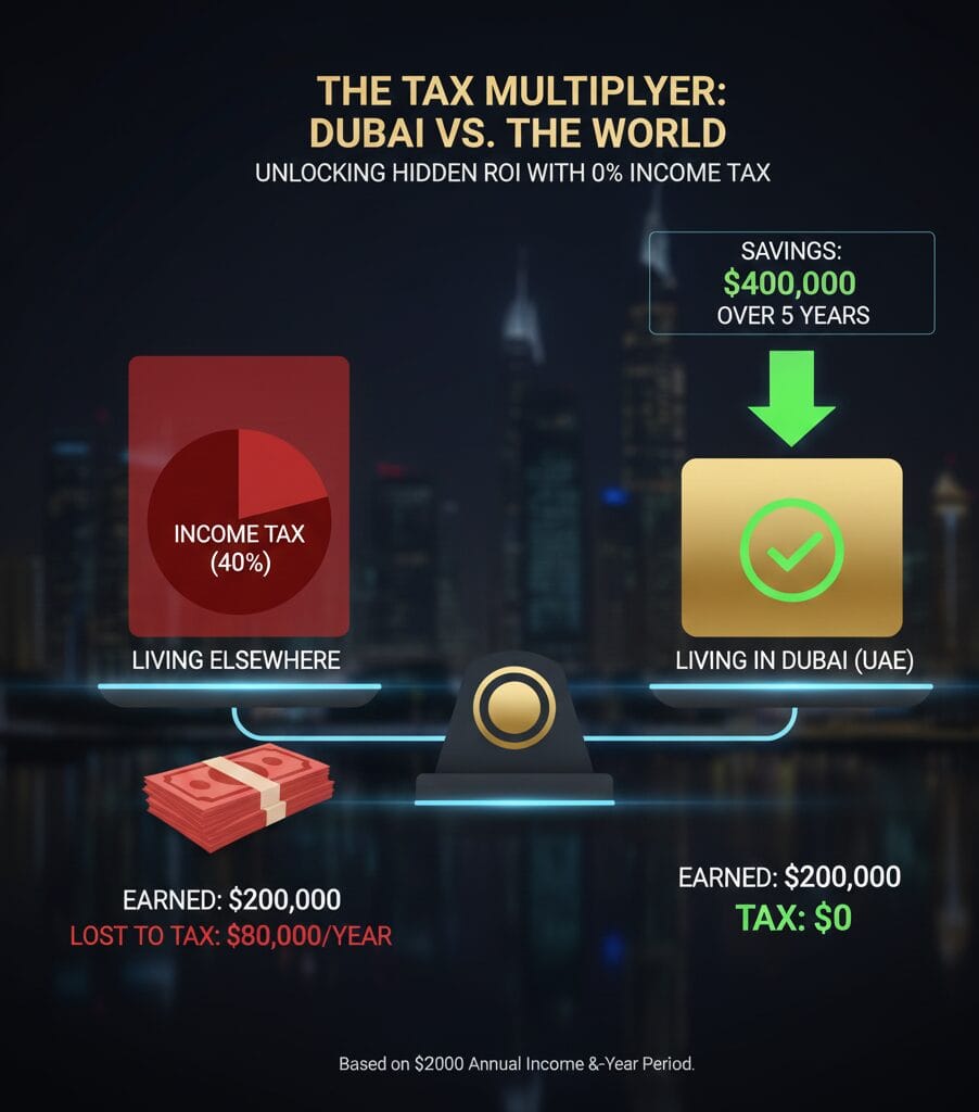 Most investors stop calculating at the rental yield. This is a mistake. The true power of the UAE Golden Visa benefits lies in the Tax Savings Multiplier.